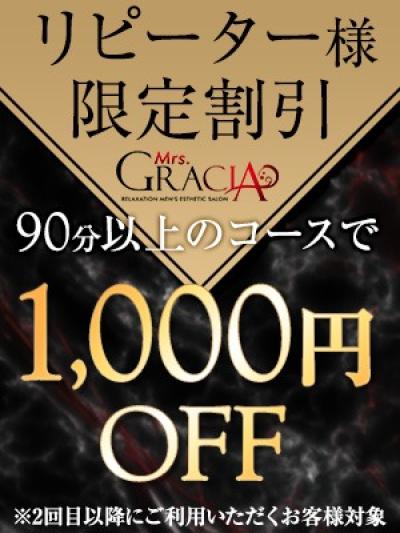 ■ご新規様/リピーター様お得割引情報■ ◆ご新規様限定割引◆ 90分以上のコース2,000円OFF ※当店を初めてご利用いただくお客様対象 ※90分コース以上対象となります。 ◆リピーター様割引◆ 90分以上のコース1,000円OFF ※2回目以降にご利用いただくお客様対象 ※90分コース以上対象となります。 【ご新規様】 70分:12,000円 90分:14,000円→12,000円 120分:16,000円→14,000円 150分:21,000円→19,000円 180分:26,000円→24,000円 延長30分:6,000円 指名料:1,000円 【営業時間】11:00~翌5:00 【受付時間】10:00~翌3:00 【HP】https://mrs-gracia.com/ 【TEL】080-4624-9003 【MAIL】mrsgracia.kago@gmail.com