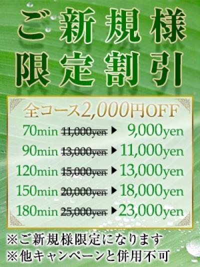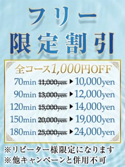 ◆ご新規様限定割引◆ 全コース2,000円OFF ※ご新規様限定になります ※他キャンペーンと併用不可 70分:11,000円 → 9,000円 90分:13,000円 → 11,000円 120分:15,000円 → 13,000円 150分:20,000円 → 18,000円 180分:25,000円 → 23,000円 延長30分:6,000円 指名料:1,000円 ◆フリー限定割引◆ 全コース1,000円OFF ※リピータ様限定になります ※他キャンペーンと併用不可 70分:11,000円 → 10,000円 90分:13,000円 → 12,000円 120分:15,000円 → 14,000円 150分:20,000円 → 19,000円 180分:25,000円 → 24,000円 延長30分:6,000円 指名料:1,000円