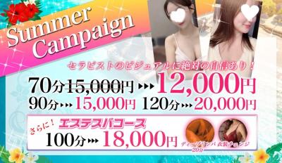 サマーキャンペーン特別価格 (7/1~期間限定) 70分 12,000円 90分 15,000円 120分 20,000円 ※他の割引と併用できません。 これからも魅力的なセラピストさんの採用、サービス&技術の向上を心がけ、 皆様に愛されるお店づくりを目指してまいります。 これからも変わらぬご愛顧のほどよろしくお願い申し上げます。